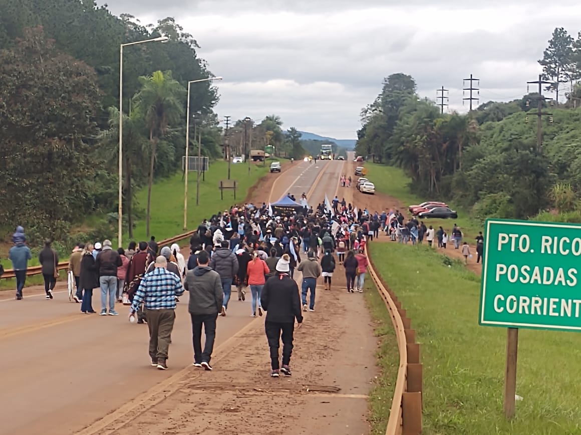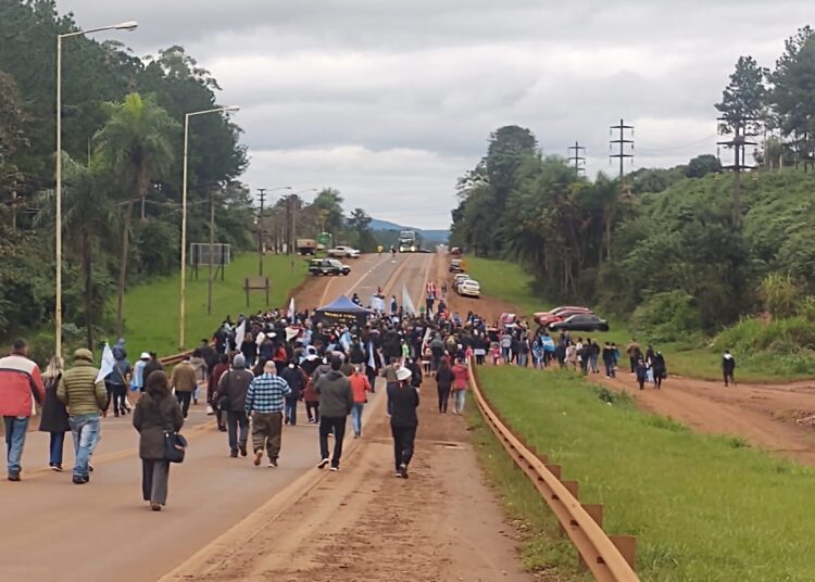 Los manifestantes, que portan banderas de la Nación Argentina y de la Provincia de Misiones, han organizado esta protesta para visibilizar y reclamar la atención de sus demandas.
