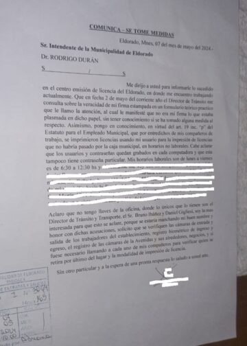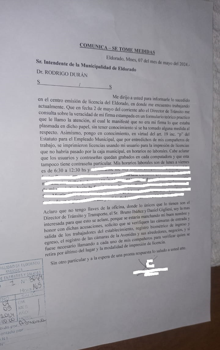 En una nota dirigida al Director de Tránsito y al Poder Ejecutivo Municipal durante la primera semana de mayo, se puso de manifiesto que: «Se imprimieron licencias utilizando mi usuario para la impresión, y dichas licencias no pasaron por la caja municipal, todo esto ocurrió en horarios no laborables.»