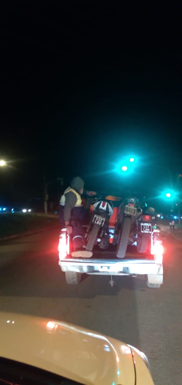 No es recomendable ni seguro transportar a una persona en la parte superior de una camioneta junto con tres motos. Esto sería extremadamente peligroso,
