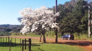 El árbol se erige como la figura más atractiva de la ciudad de Eldorado, al transitar por Tránsito Pesado, no se puede evitar maravillarse con tanta belleza. Lapacho Blanco, lo han denominado, con flores blancas es una variedad muy poca vista, sí es claro que su rareza lo convierte en uno de los árboles más preciados y codiciados en esta época del año.