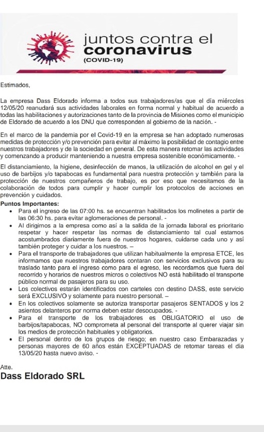 Mañana miércoles la empresa vuelve abrir las puertas a los trabajadores, en forma normal y habitual de acuerdo a todas habilitaciones y autorizaciones tanto de la Provincia de Misiones, como el municipio de Eldorado de acuerdo a los DNU que corresponde al gobierno de la Nación. Los personales deberán estar presentes en el lugar de trabajo a partir de las 6,30, evitando la aglomeración. El ingreso será a partir de las 7,00 horas.