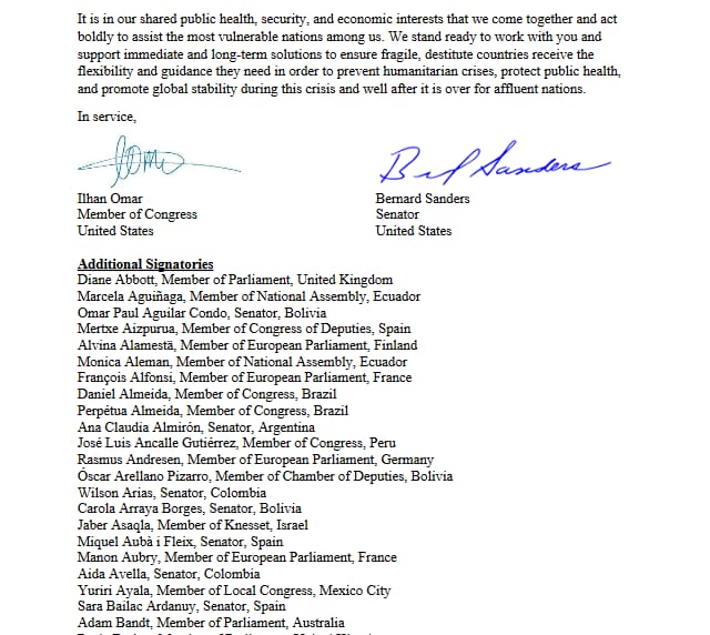 Más de 300 legisladores de todo el mundo, entre ellos más de 40 argentinos, propusieron hoy que el Fondo Monetario Internacional y el Banco Mundial cancelen la deuda de los países más vulnerables y aumenten fondos (DEGS) para evitar una crisis global ante la pandemia del coronavirus. La iniciativa es encabezada por el ex candidato a la presidencia de Estados Unidos Bernie Sanders