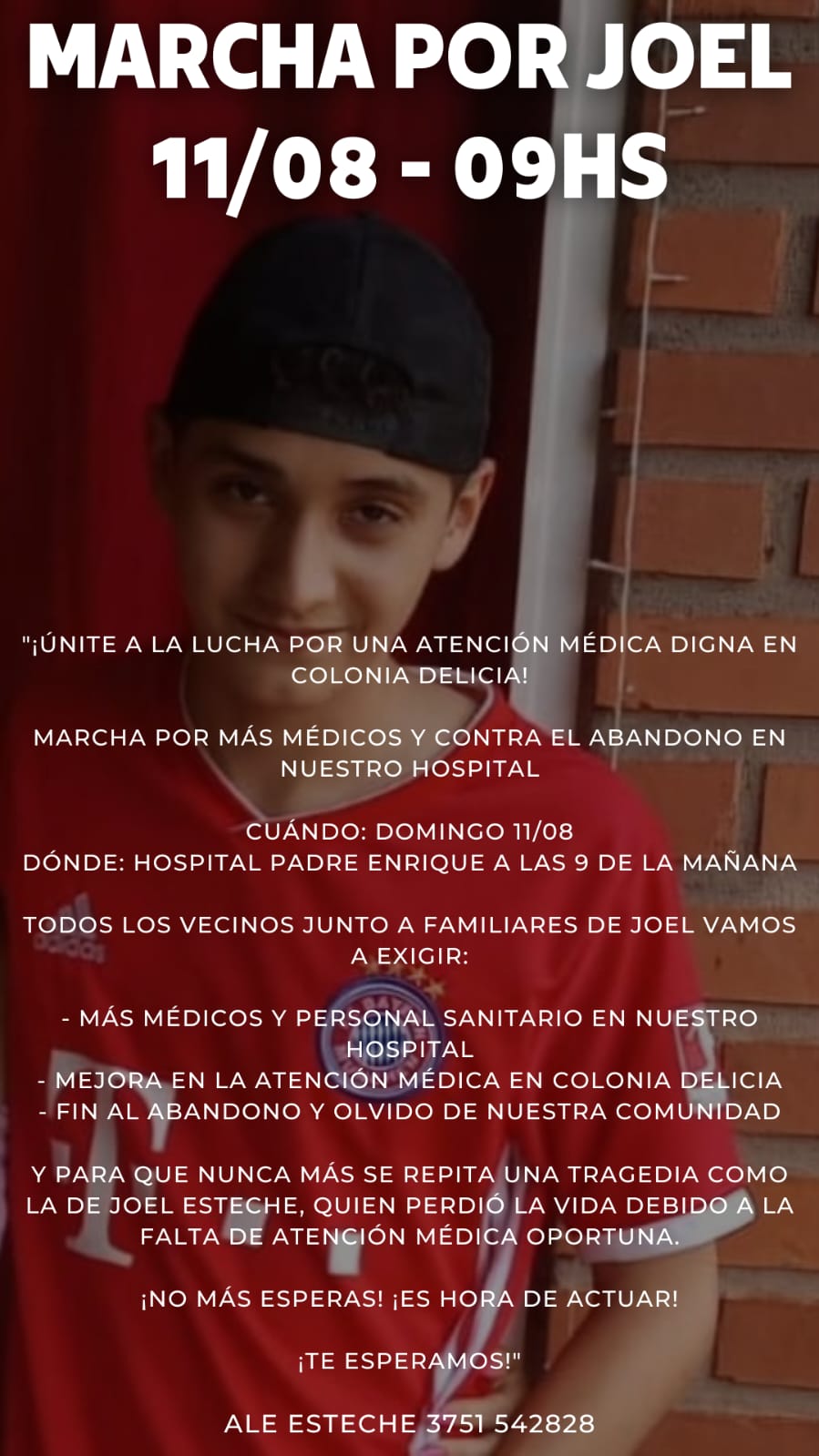 «Y para que nunca más se repita un tragedia como la de Joel Esteche (14), quien perdió la vida debido a la falta de atención médica oportuna».