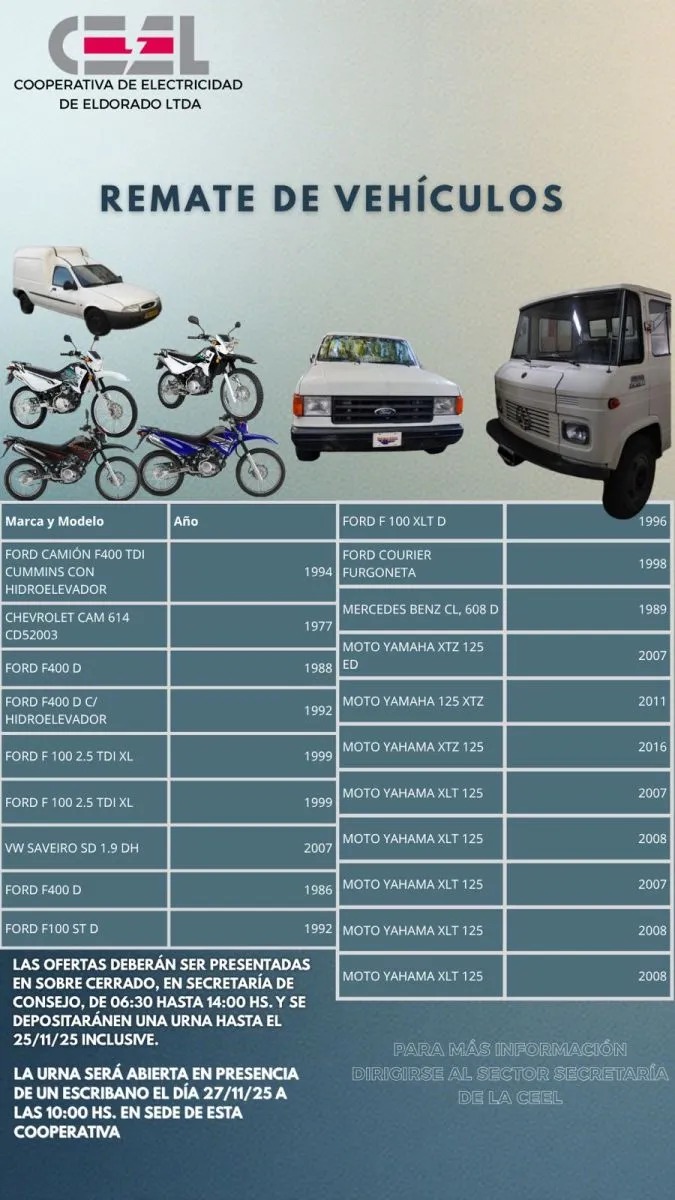 El remate de vehículos organizado por la Cooperativa de Electricidad de Eldorado (CEEL) fue postergado una semana, según confirmó a este medio el consejero Germán Chemes. La apertura de sobres, prevista inicialmente para esta semana, se realizará finalmente el viernes próximo, en presencia de un escribano para garantizar la total transparencia del proceso.