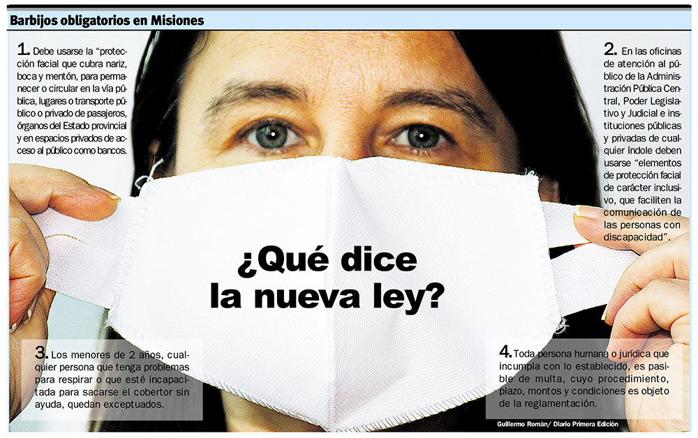 El martes 30 de junio, el Gobierno de Misiones publicó en el Boletín Oficial la Ley Provincial XVII Nº 118, en la que se promulgó el uso obligatorio de protección facial, ya sea barbijos o tapabocas/tapabocas inclusivos, y el “Pasaporte Sanitario”. La norma establece que “toda persona humana o jurídica que incumpla con lo establecido (…) es pasible de multa”.